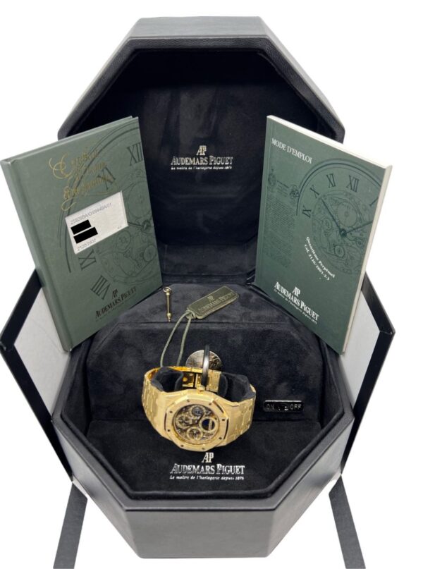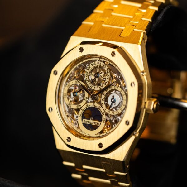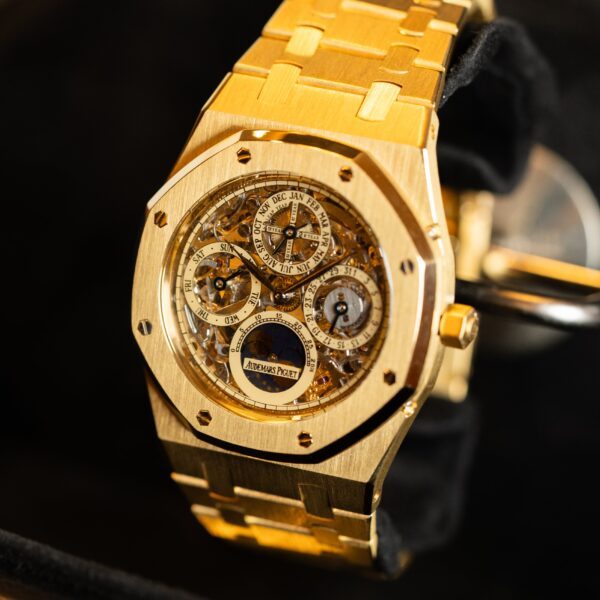 Eleven years after the Royal Oak was introduced, Audemars Piguet released a complicated take on its iconic luxury sports watch. The Royal Oak Perpetual Calendar that debuted in 1983 is considered the forerunner for the complicated sports watch genre. The present watch is a skeletonized version, both the sapphire display back and the skeletonized dial enable the viewer to clearly see how spectacular the movement was made from the front and back. It is noteworthy that the rotor and the bridges were not just skeletonized, they are also finely engraved with complex vine motifs. Preserved in new condition kept in the safe from the first owner and is completed with all of its accessories, this Royal Oak Perpetual Calendar Openworked is without doubt an immensely pleasing watch to wear and enjoy.
