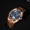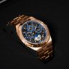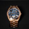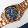 Both contemporary and very horological, this watch in 750/1000 5N pink gold contains an ultra-thin, fully skeletonized perpetual calendar. Exact until 2100, the calendar is completed by a moon phase with a starry sky and two gold moons. The fine watchmaking finishes and gray tone of this NAC-treated caliber can be observed both from the front and through the sapphire crystal case back. The watch is customizable thanks to its three easily interchangeable straps – leather, rubber and 750/1000 5N rose gold